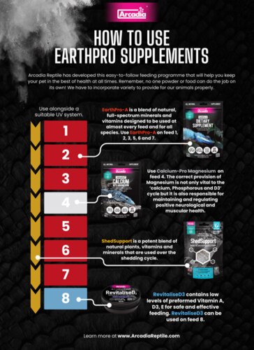 The Arcadia feeding cycle includes EarthPro-A, CalciumProMg, and Revitalise D3 —balanced vitamin and mineral powders designed to meet specific nutritional needs at each stage of the cycle. When used together in the suggested sequence, these supplements provide the full spectrum of vitamins and minerals essential for the species' diet, while avoiding issues like overdosing or loss of potency within the body. During the shedding period, Shed Support can be incorporated to aid the process.